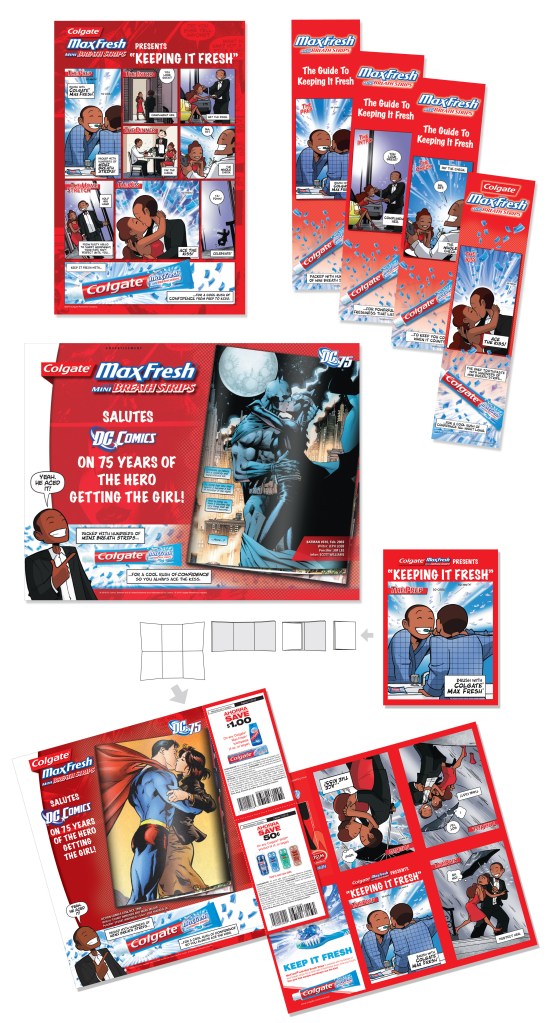 Colgate Advertising Campaign – The “Keeping it Fresh” Campaign was created in conjunction with DC Comics 75th anniversary. This print campaign featured multiple components including a single page ad, spread ads, poster, third page cascading ads, and a fold up inserts that were tipped into publications and distributed with sample Colgate product to college campuses.