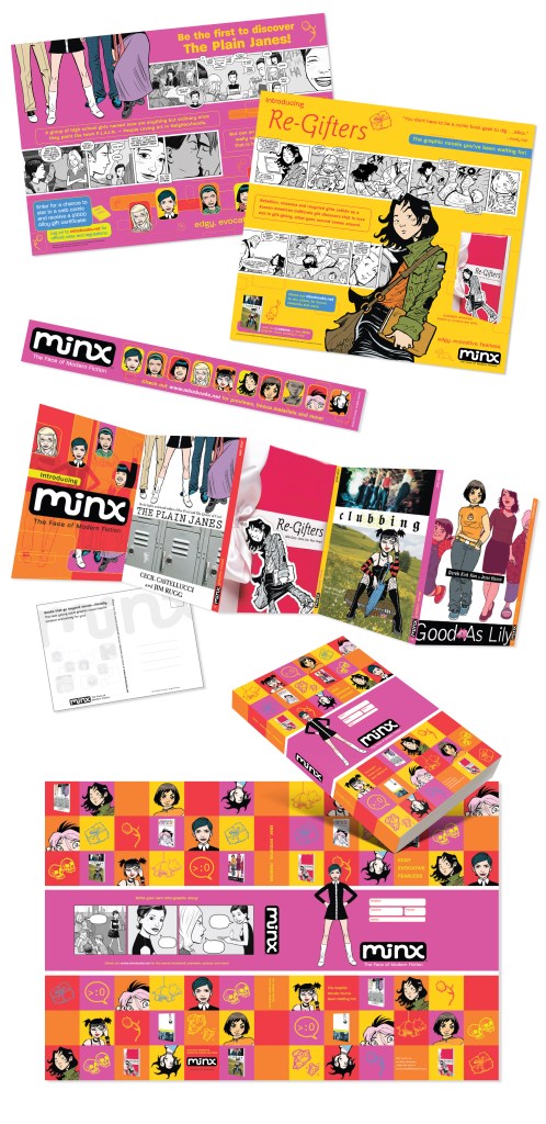 MINX Advertising Campaign – Comics are not just for boys! DC Comics created MINX – a new line of graphic novels geared towards teenage girls. Print advertising featured in Alloy catalogs. Promotional bookmark and postcards created for bookstores, and textbook wraps were shipped to middle schools across America.