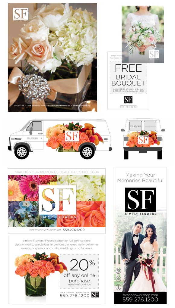 Simply Flowers re-brand and marketing materials – This Central California florist was looking to appeal to a more upscale audience. A new logo and simplified design brought the focus to where it should be: On the beautiful flowers!