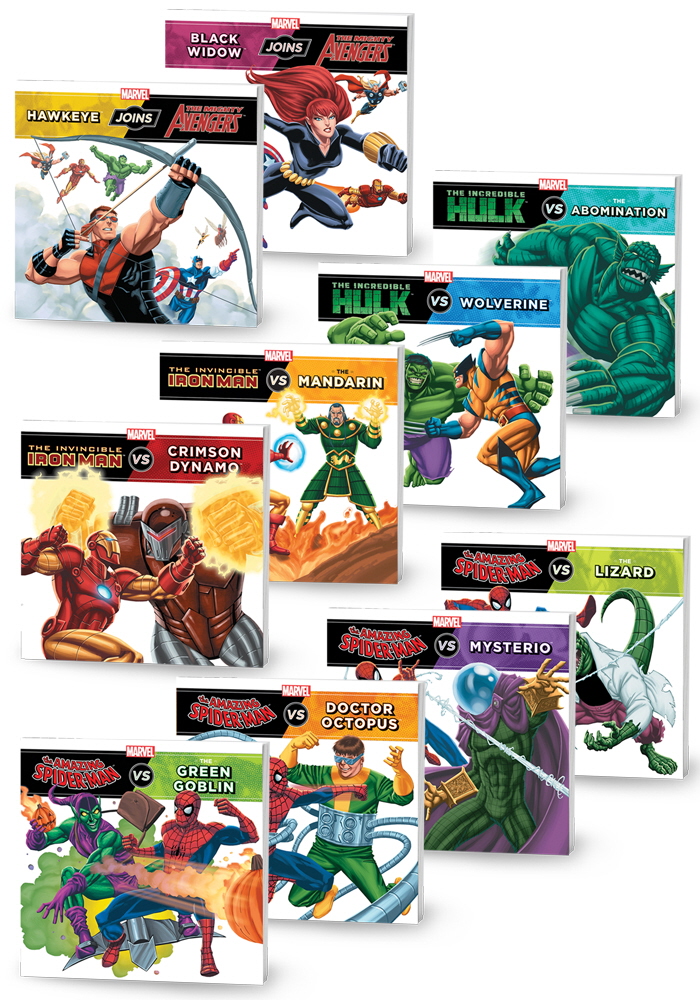 Marvel Press 8×8 books – An assortment of children’s picture books, art directed and designed, featuring Marvel comics characters such as Spider-man, Hulk, Iron Man, and the Avengers.